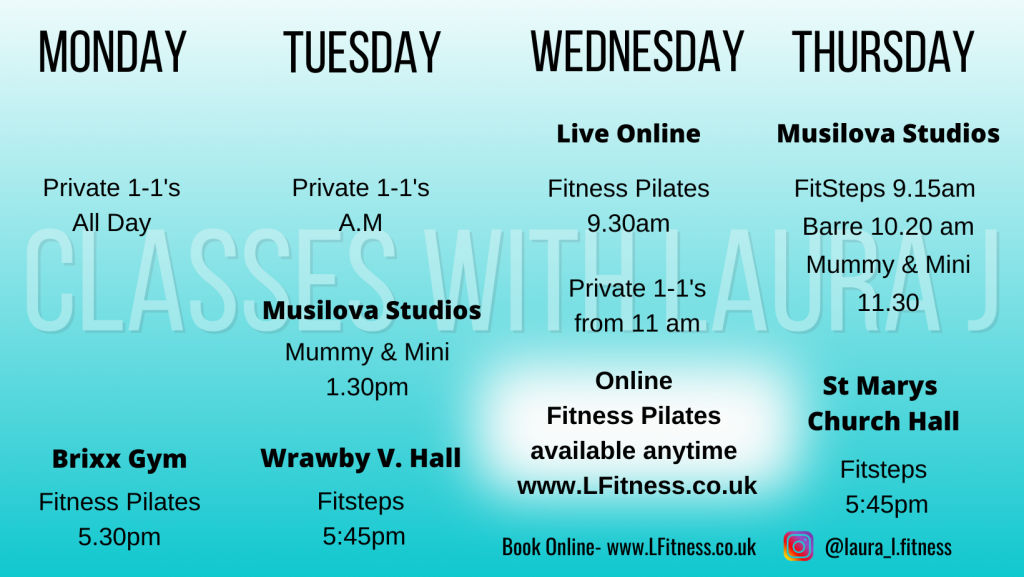 All classes are subject to change due to illness/holidays, any updates/changes are posted on Classes With Laura J